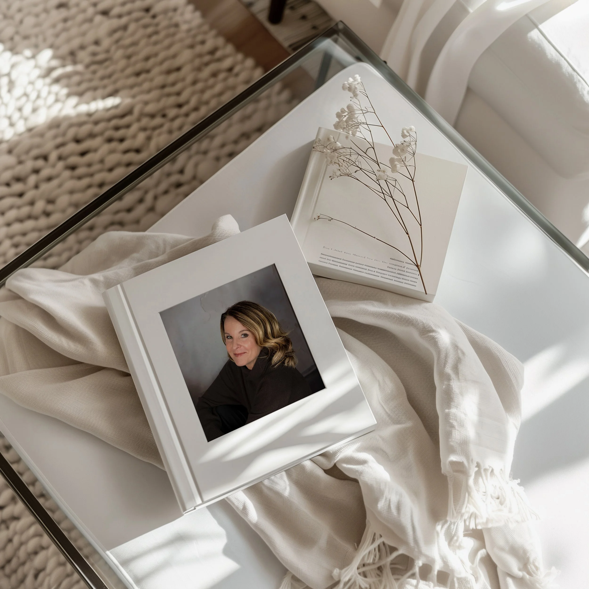 Ein aufgeschlagenes Fotobuch mit einem Porträt einer lachenden Frau liegt auf einem Stapel anderer Bücher auf einem Couchtisch, im Hintergrund ist ein weiches Kissen und Stoff. Die Bildqualität ist hochauflösend, mit natürlichen Farben.